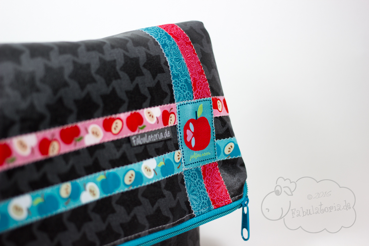 Wenn man nun geübter im Taschen nähen ist, dann hat man also ein wirklich schnelles Projekt oder eben viel zusätzliche Zeit zum betüddeln. Und ob der Größe der Kosmetiktasche, bietet sie genug Fläche um sich kreativ auszutoben. Das einzige was zu beachten ist, dass man wegen des Foldover-Effekts ggf. auf dem Kopf gedreht verzieren muss. Nachdem ich mich für schlichte beschichtete Baumwollstoffe entscheiden hatte, durfte ich wieder ausgiebig in meiner Webbandsammlung kramen.